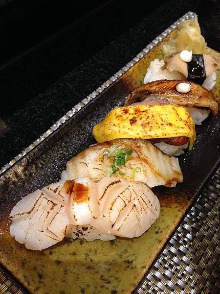 炙燒干貝 / 比目魚裙邊炙握 / 起士櫻桃鴨 / 鰻魚握 / 鮑魚握壽司