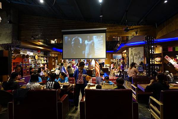 從中間我們的用餐區域網門口看的樣子是這樣,店內會一直播放著有點復古的美式曲風歌曲,配上大投影片來播MV,蠻有趣的。