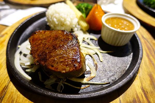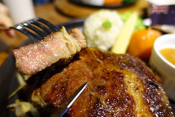 牛小排是特選牛隻的前胸肋骨, 吃起來有醃製過的味道,肉質感覺起來是熟成牛不是冷凍牛所以就算是五分熟也都沒有血水唷!