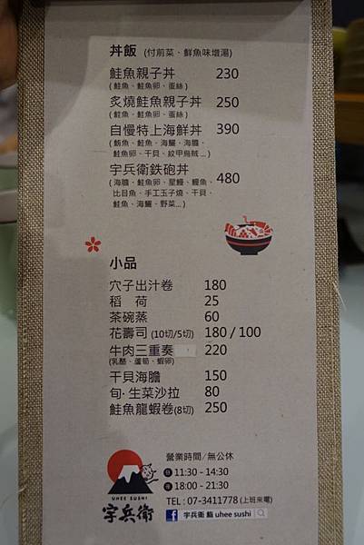 宇兵衛的菜單沒有彩圖,但有Q版示意圖,蠻可愛的!