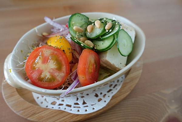 裡頭有番茄、彩椒、紫洋蔥、小黃瓜、豆腐、高麗菜還有吃不完的苜蓿芽!