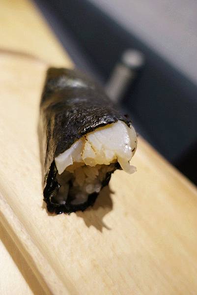 左邊的大干貝被剪成了四塊,中間的鮭魚有四片,右邊的星鰻也有三片,加上一匙鮭魚卵,和兩塊三角玉子燒!
