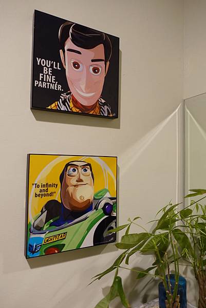 洗手間的部分很乾淨明亮,鏡子旁邊還有胡迪和巴斯光年也有點可愛