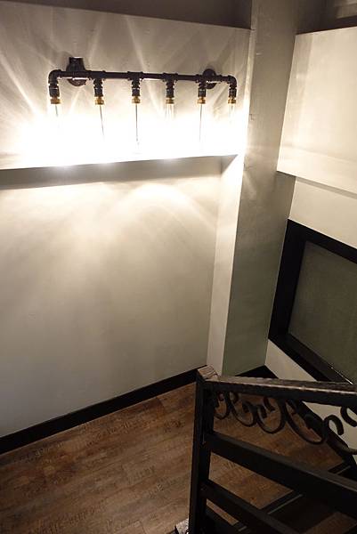 往二樓樓梯的燈蠻特別的,水管燈泡製造一種輕工業風格。