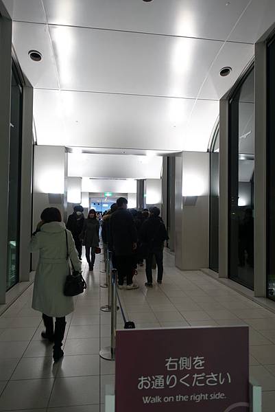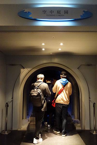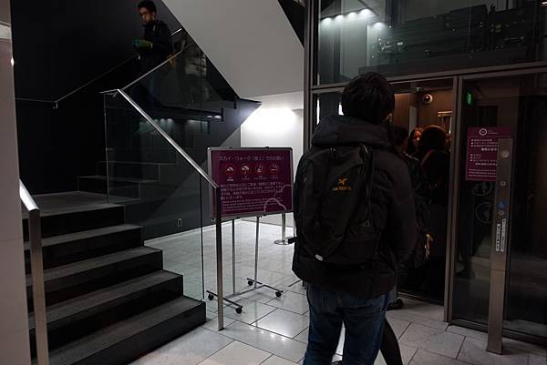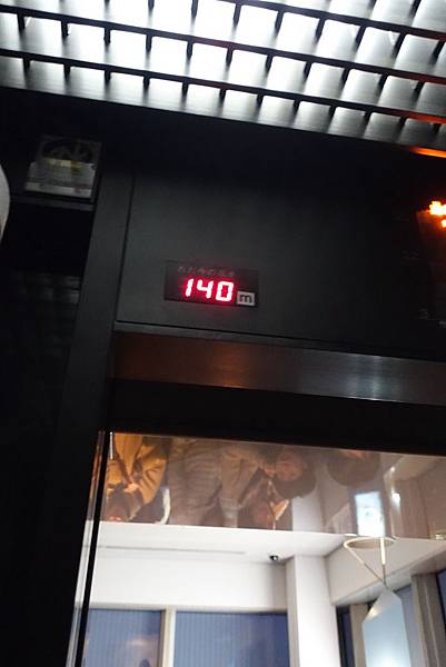 尋著指標搭乘電扶梯上樓後會有指標繼續走後進入排隊隊伍,由工作人員做人數管控搭電梯上到35樓 (140m高度處)