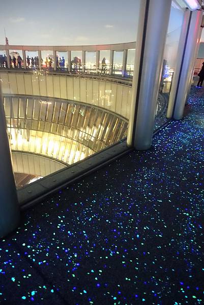 夜景展望台是呈現一個圓形,地板鋪上紫紫藍藍綠綠亮晶晶的很美。