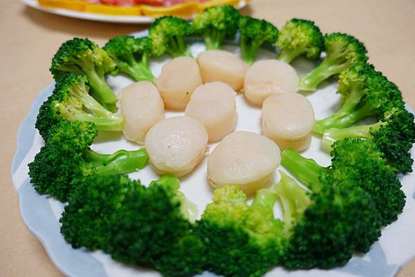 再擺上花椰菜圍繞著干貝們,干貝非常軟非常新鮮,很好吃!