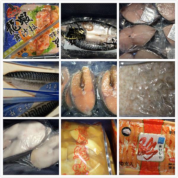 海霸王龍蝦沙拉、一夜干(鯖魚)、挪威厚切大鮭魚、厚切無洞土魠魚、北大西洋鱈魚、貴妃鮑片、蝦仁、松葉蟹肉棒