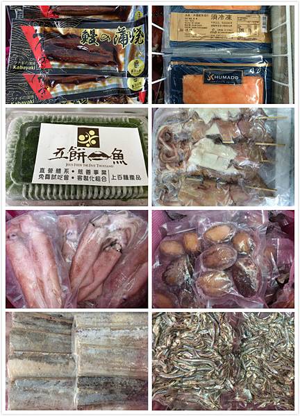 蒲燒鰻288、煙燻鮭魚片159、翡翠海菜39、 阿根廷大魷魚59、九孔鮑魚233、小捲159、白帶魚189、頂級丁香魚109