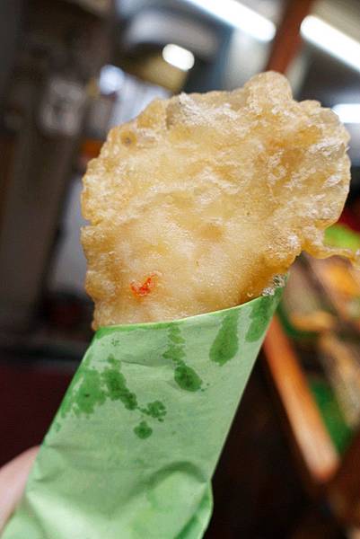 她是攤平蝦子下去炸的,所以不像常見的炸蝦是一根圓圓的,但也就正是因為它是攤平狀態,所以那個蝦肉與外皮一口一口這樣吃非常好吃阿!
