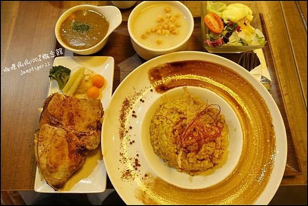 這頓飯出乎意料也是好大一盤,而且還有擺盤樣式,燉飯的米心很透,咖哩一起下去燉煮所以非常入味!