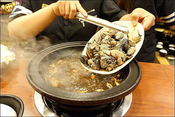 我點的是萬客燒酒雞鍋,店員拿出一整罐料理米酒,要全酒還是半酒,我想說全酒吧~