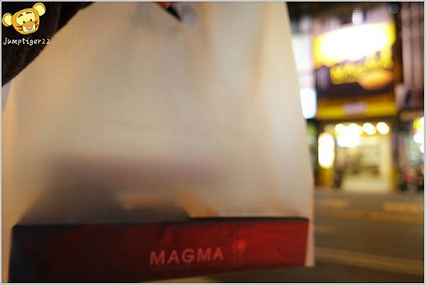 ▼ 提著裝好的禮盒回到對面與遠方MAGMA暖黃的店面合照後,我帶回家享用了哈哈