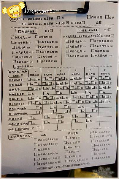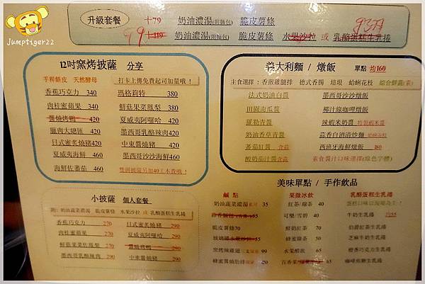 ▼菜單主要分為窯烤披薩與義大利麵/燉飯,然後可以加價升級成套餐,分成加價79與99兩種唷!