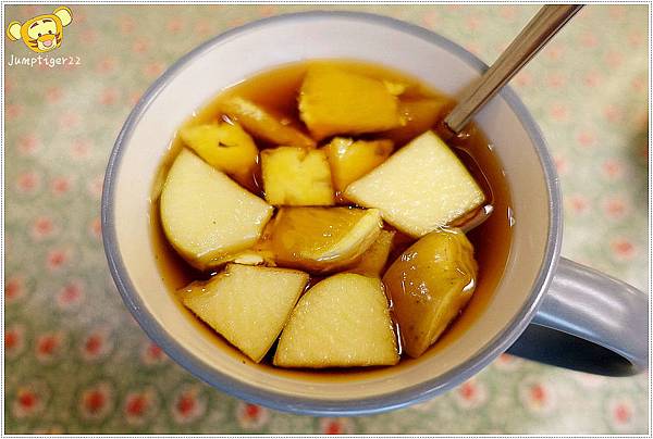 ▼ 水果茶內鳳梨、蘋果柳橙都有,喝起來水果香氣很足而且散發水果自身的酸甜味!