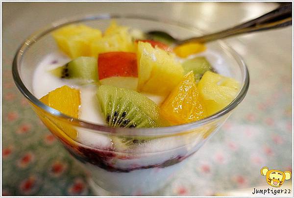 這優格水果杯更厲害,上面的新鮮水果看起來就很威,還另外加了果醬!