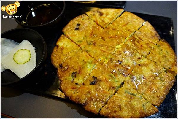 海鮮煎餅中的用料也蠻實在的,外皮偏酥脆一點,沾點附上的醬汁鹹鹹甜甜的更好吃~