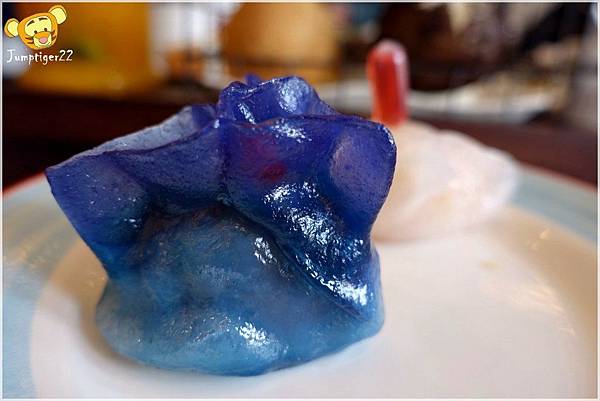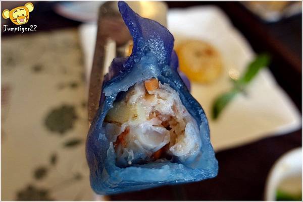 蝶豆花水晶蝦餃,光是使用蝶豆花來當成外皮的想法就創意十足,外表吸睛度超高啊!
