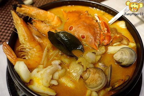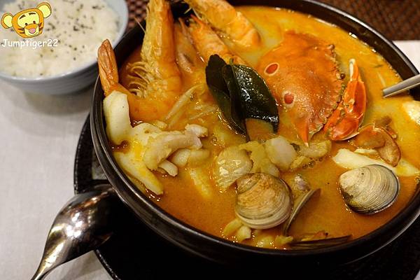 除了三點蟹跟蝦仔外,還有蛤蜊、花枝、魚片等海鮮,湯頭走南洋咖哩風,辣中帶著巧勁,一入口彷彿著上草裙舞般搖曳(浮誇)