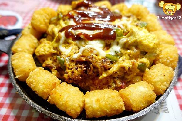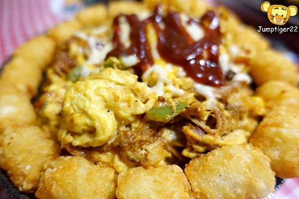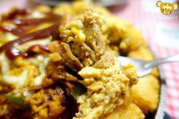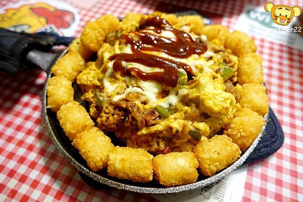 其實就是豬肉絲炒蛋炒蛋,裡頭還有洋蔥/青椒/蕃茄,最後上面放上起司,再淋上番茄醬。