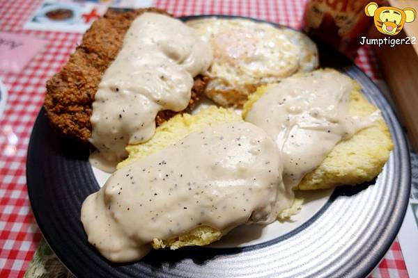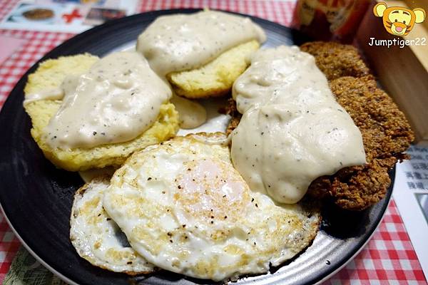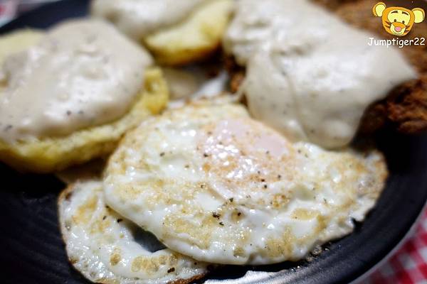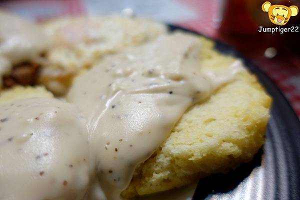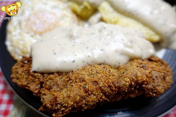 兩顆荷包蛋,兩個比司吉,還有一塊超出盤緣的炸牛排,上頭再淋上自製白醬,我喜歡這種不拘小節的豪邁感~