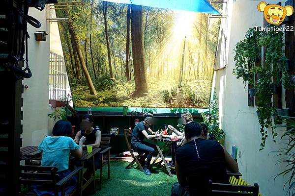地上來鋪上綠色草皮,陽光從帆布中滲入讓整個空間清新了起來,就算是假草地這樣用餐起來也很愜意啊!