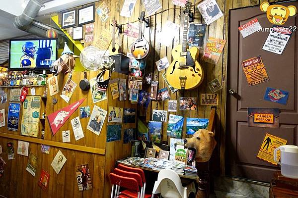 牆上貼滿明信片,個性小卡/裝飾,另一面牆甚至高掛著樂器,感覺興致來的時候就可以取下彈上個兩首美式鄉村風音樂!