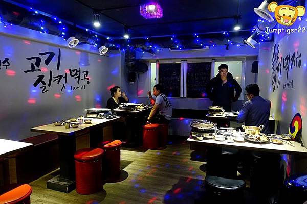 用餐區在二樓,爬上樓後看到這樣螢光閃亮風實在是很有韓式阿珠媽唱歌店那種氛圍(韓劇那種卡啦OK店啊哈哈)