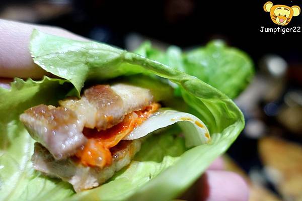 健康吃法就是要包生菜哦哈哈哈上頭還要放塊泡菜,五花肉一點也不油膩整個清爽帶小辣超好吃