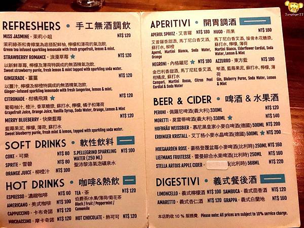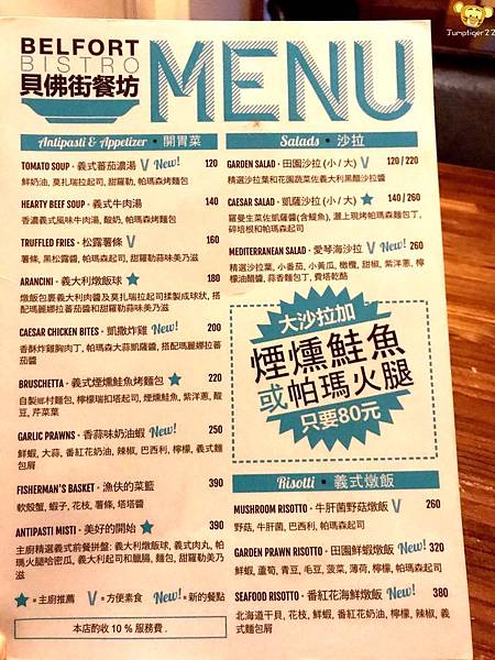 貝佛街的菜單,從開胃菜/沙拉,燉飯/義大利麵,還有豬排牛排等主餐,選擇不多但也算是齊全。