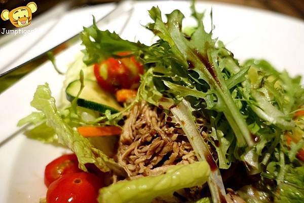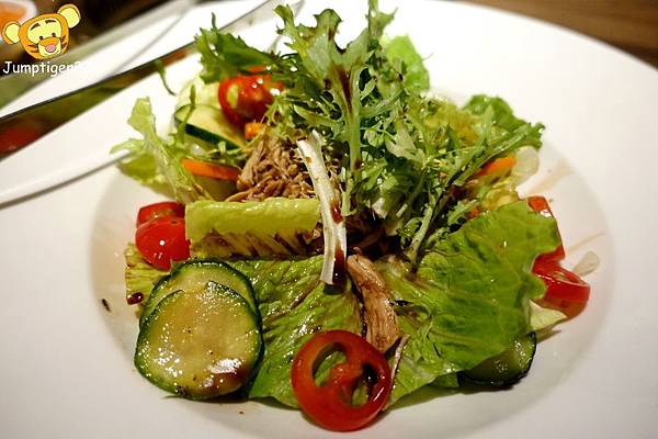 以雙人份的沙拉份量來看還算可以,醬料像是油醋醬,微酸但很解膩開胃,吃肉吃一吃來口沙拉非常清爽!