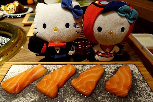 這次有兩隻KITTY小貓,黏黏和臭臭吵著要吃魚,好吧就點份鮭魚給她們倆吧!