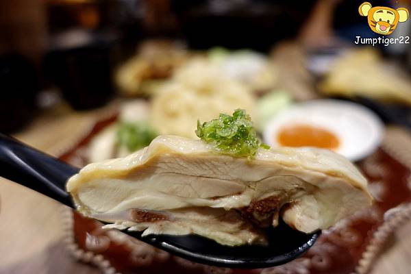 海南雞的肉質滑嫩,滿滿雞汁味濃再藉由蔥油提味更香,沾點辣醬更有南洋微辣感