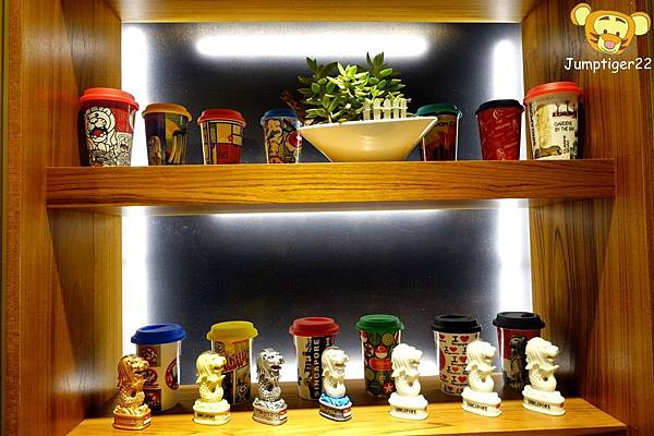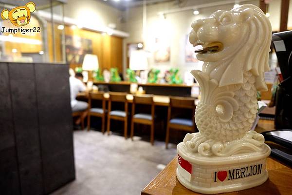 ▼ 店裡擺放有著魚尾獅圖案的新加坡特色杯,還有一整排魚尾獅的小雕像裝飾