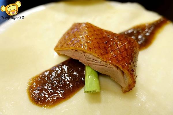 抹上甜麵醬,放上提味蔥條,挑一塊帶皮的片鴨肉,漂亮包覆後入口~