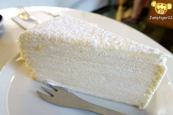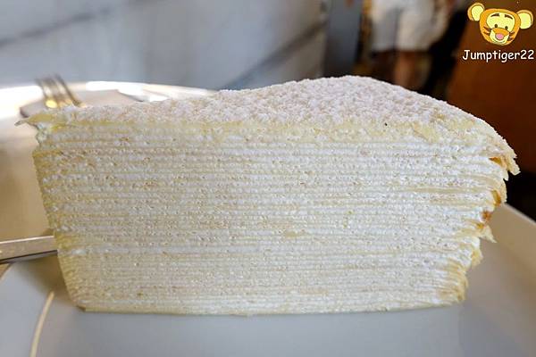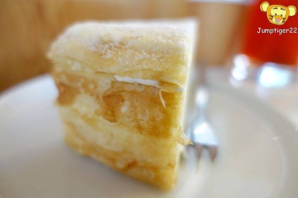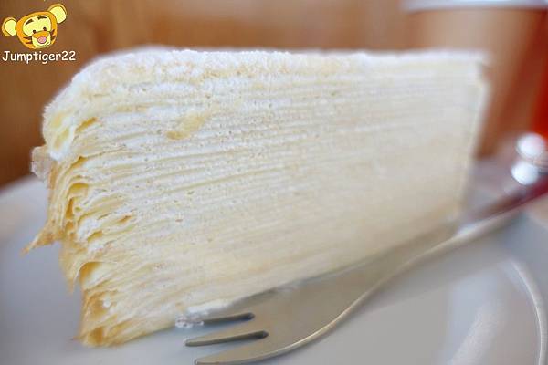 米白色的千層蛋糕從側面觀賞,一種不知道是被嗅覺導引視覺感到好想吃而眼花,還是真的多層到眼花了啊!