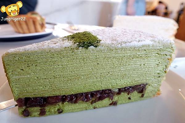 帶著抹茶香濃的千層味道果真也很棒,但讓人更喜歡的是這裡頭還夾有紅豆!