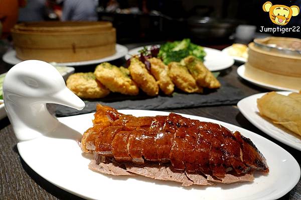 茶資、片皮鴨(半隻附餅)、珍菌鴨架湯、金沙鱈魚塊、清炒時蔬、臘味煲仔飯、小點X2、中點X2、芋頭西米露