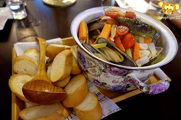 旁邊還有附上可以沾著吃的法式麵包,沾上這白酒醬汁超級配!