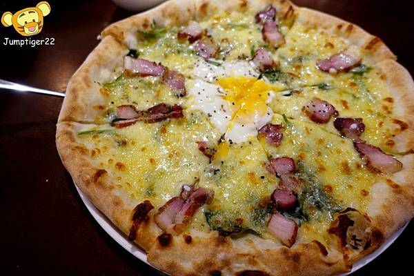 大蒜醬底配上坡菜與培根之外,還有中心的蛋香,算是好看又好吃的披薩唷