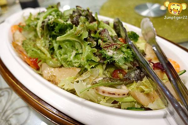 這道沙拉很不錯,開胃清爽,海鮮有蝦有中卷還有鮑魚片