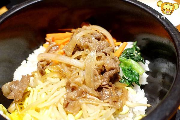 牛肉和洋蔥翻炒過後蠻鹹香,剛好跟飯一同攪和就很有味道,因為下層的蔬食鋪了不少,整個石鍋拌飯也增添了清爽感