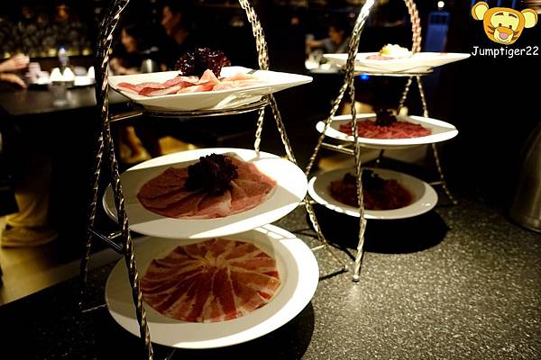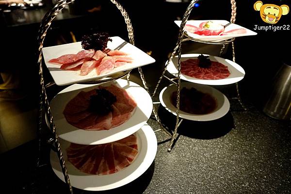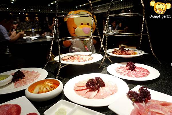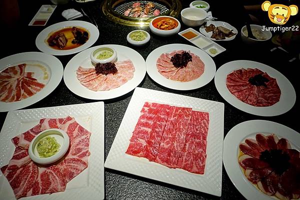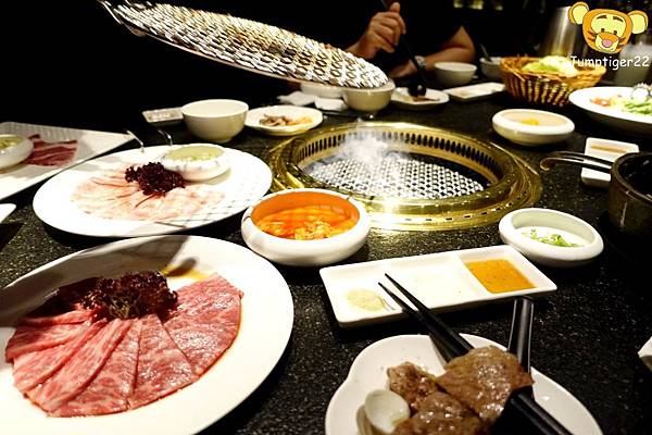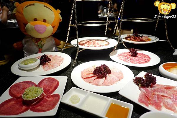 很快的燒肉們就上桌了,這種像是貴婦下午茶級的燒肉擺盤首見還真讓人感到驚奇,不過這有個很大的問題就是超難拍照的哈哈哈