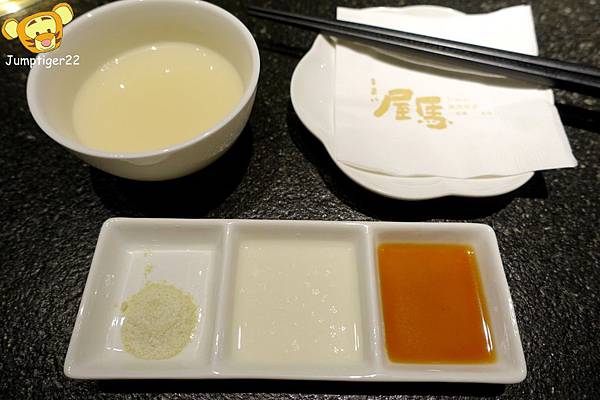 ▼ 屋馬的雞湯與醬料,昆布鹽/檸檬汁/燒肉醬