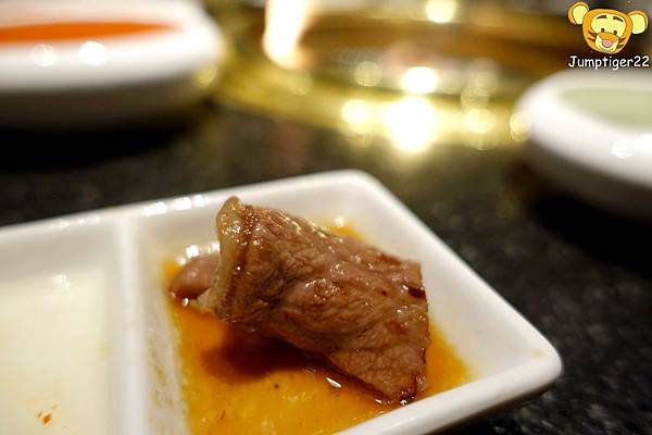 嘿嘿嘿沾點烤肉醬汁,鹹甜甘的醬汁和軟嫩的牛小排搭在一起真的HEN好吃!