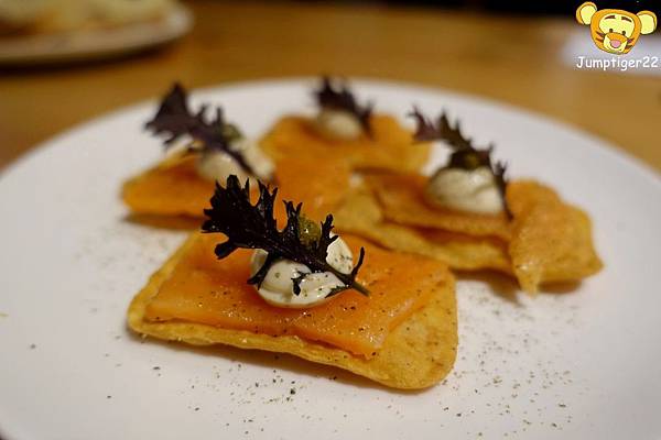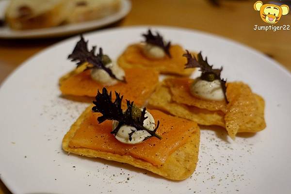 鹹鹹香脆的冬筍餅,鋪上柔嫩的煙燻鮭魚片,點上凱薩醬後再配顆酸豆這滋味超凡,超過平凡!