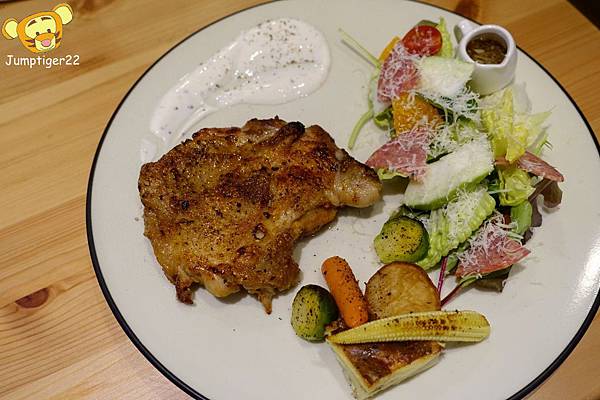 那一天總是讓我驚豔,雞腿排附上的沾醬是蜂蜜酸奶油,白色的醬汁酸中帶甜之餘還有奶香,讓美味的雞腿排更上層樓啊!