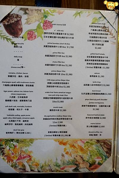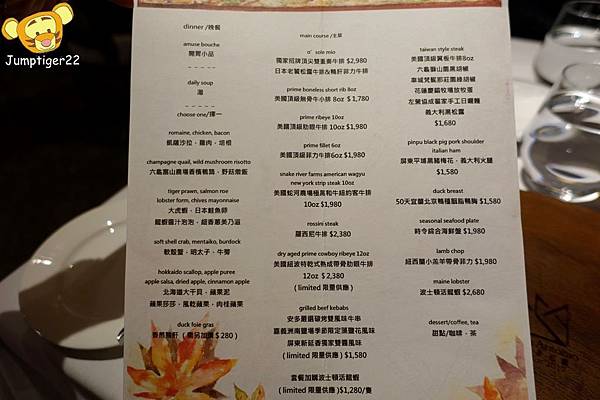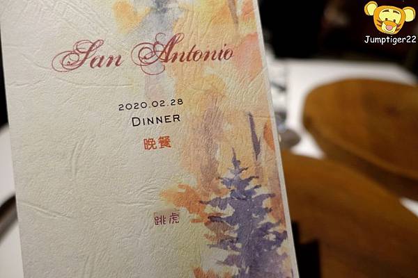 晚餐的菜單,其中還會依照訂位人名字下去客製化專屬菜單,像這個菜單上面本來是我的名字,但我有點害羞,塗改成跳虎啦XD