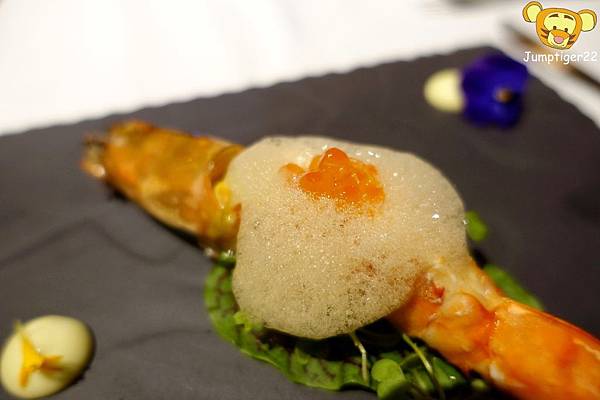 鮮蝦醬汁泡泡堪稱此道菜的靈魂,超鮮超綿密的泡泡讓彈牙肥美的大虎蝦更是鮮美
