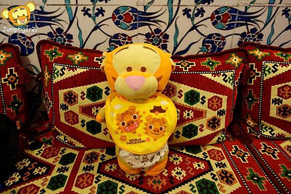 ▼穿著日本沖繩圍兜的跳虎....我下次先請代購幫你買土耳其圖騰的圍兜好了